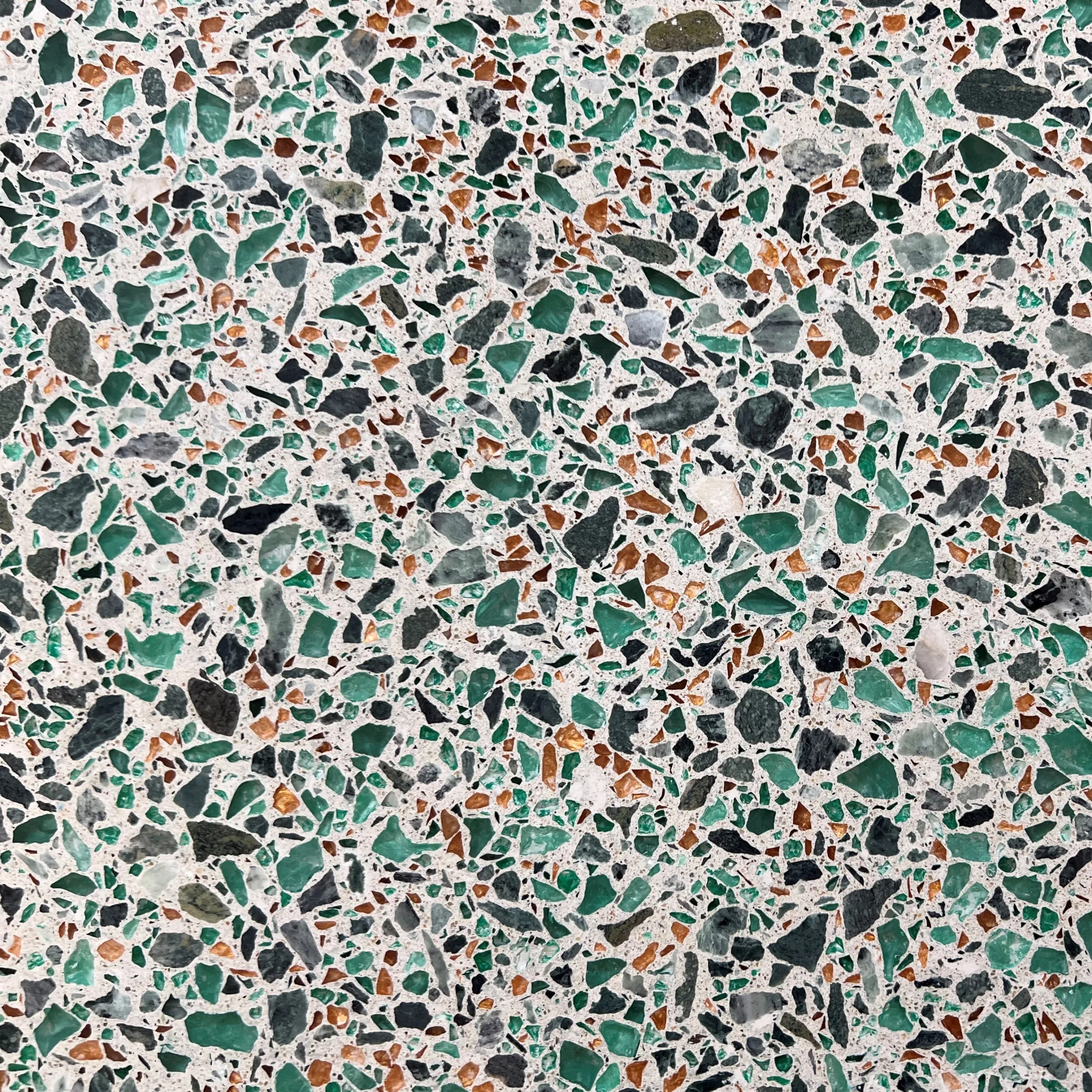 Gussterrazzo-Rezeptur mit zementgebundenen Bindemittel und Marmorsplitt und Glasgranulat.